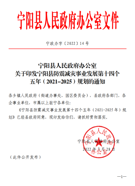 《寧陽縣防震減災事業發展第十四個五年(2021-2025年)規劃》已經縣政府同意,現印發給你們,請抓好貫徹落實。
