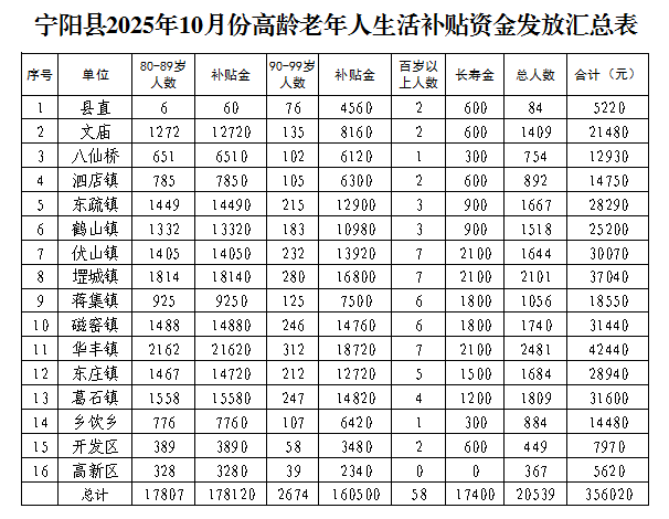 【高齡補貼發放情況】寧陽縣2025年10月份高齡補貼發放明細表