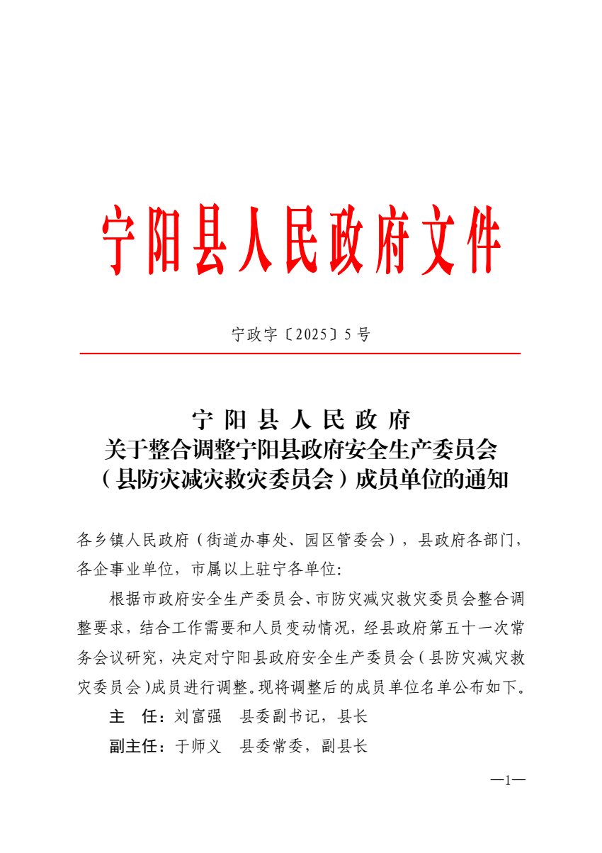根據(jù)市政府安全生產(chǎn)委員會、市防災(zāi)減災(zāi)救災(zāi)委員會整合調(diào)整要求,結(jié)合工作需要和人員變動情況,經(jīng)縣政府第五十一次常務(wù)會議研究,決定對寧陽縣政府安全生產(chǎn)委員會(縣防災(zāi)減災(zāi)救災(zāi)委員會)成員進行調(diào)整。現(xiàn)將調(diào)整后的成員單位名單公布如下。