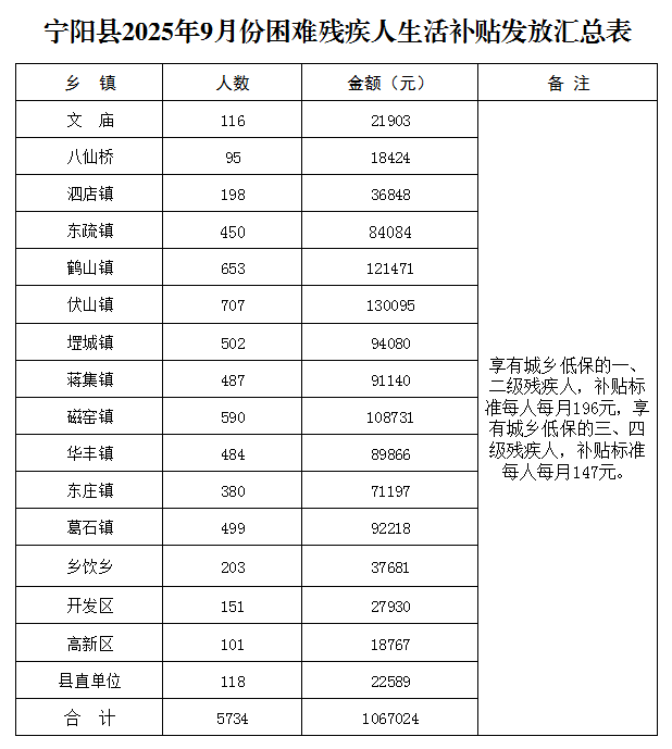 【殘疾人福利發放情況】:寧陽縣2025年9月份困難殘疾人生活補貼發放匯總表