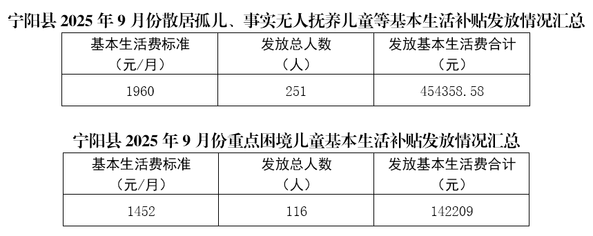 【兒童福利補貼發放情況】:寧陽縣2025年9月份孤困兒童生活費發放情況匯總