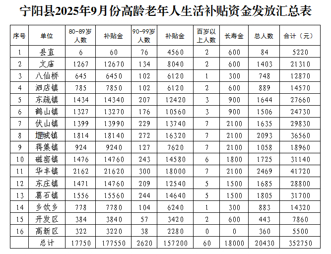 【高齡補貼發放情況】寧陽縣2025年9月份高齡補貼發放明細表